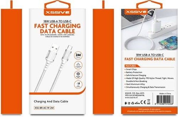 Xssive Braided 18W USB-A to USB-C Cable 2meter Wit